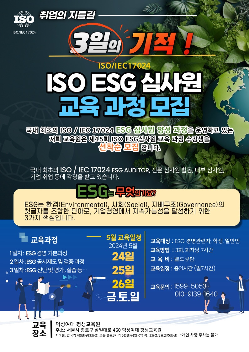[새로운 발견] 취업에 매우 유리하면서, 인력이 매우 부족한 일이 있다네요~, "새로운 도전" ISO ESG + ISO 19011 + ISO 45001 심사원을 한번에...!!!