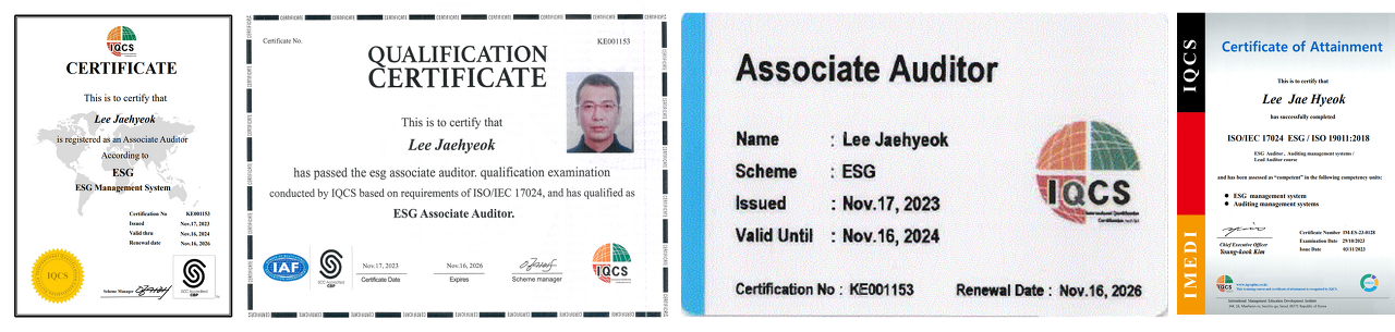 ◇ ISO ESG 심사원 + ISO19011 심사원 + ISO9001 심사원 + ISO14001 심사원 + ISO45001 심사원